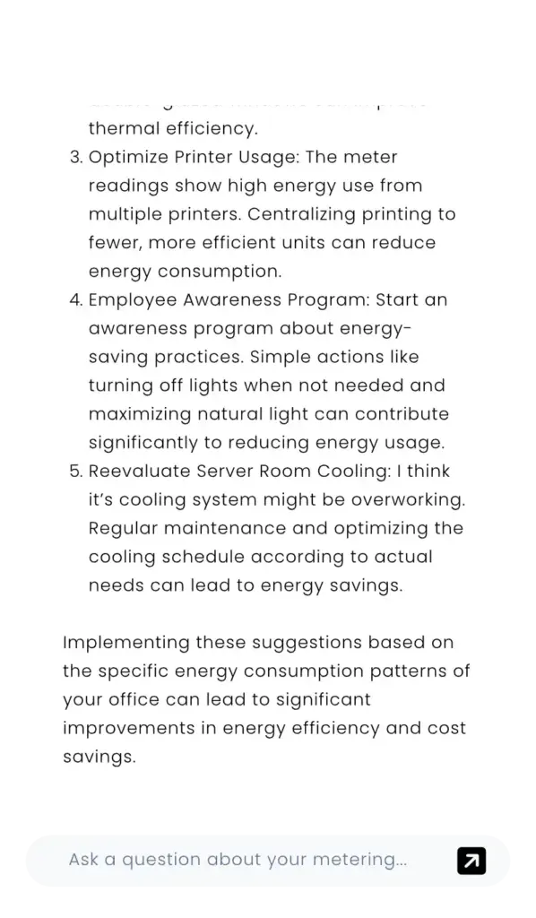 AI-powered platform interprets the collected energy data and provides actionable recommendations. These insights help you optimise energy efficiency and uncover cost-saving opportunities.